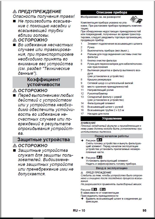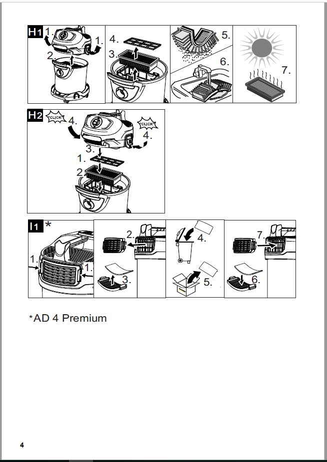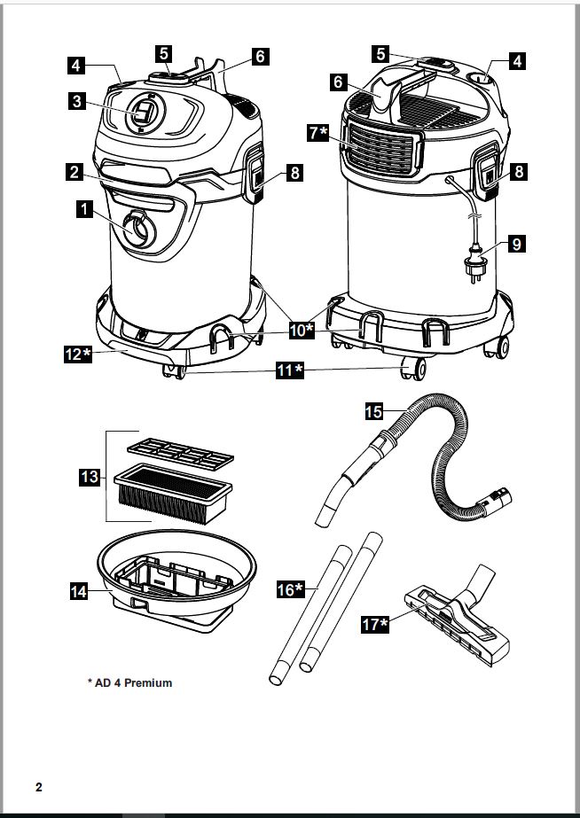 1-компонентная фильтрующая система - включает плоский складчатый фильтр, металлический фильтр и фильтр для крупного мусора. Дополняется отдельным выходным фильтром (только у пылесоса AD 4 Premium). Обеспечиваются легкое извлечение фильтра и опустошение мусоросборника без контакта с грязью.
