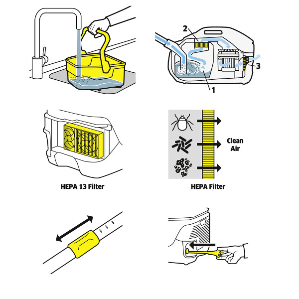 DS 6 Premium Mediclean - это пылесос с водяным фильтром, который не только тщательно очищает пол, но и обеспечивает более свежий воздух, а также использованный воздух, который на 99,95% очищен от пыли. Это заметно улучшает воздух, и вместе с тем, ощущение в комнате. В отличие от обычных пылесосов с мешками для фильтров, пылесос DS 6 Premium Mediclean с водяным фильтром использует естественную силу воды, которая вращается вокруг фильтра на высоких скоростях. Загрязненная грязь должна проходить через эту вихревую воду, которая очень эффективно отфильтровывает ее из воздуха и удерживает в воде. Результат - свежий, необычайно чистый вытяжной воздух.